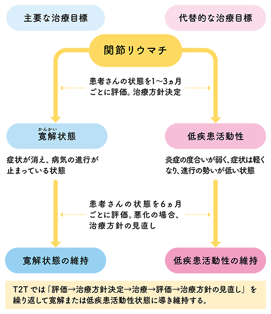 関節リウマチでは、「患者とリウマチ医の合意に基づいて行われるべきである」との言葉で始まるTreat to Target(目標達成に向けた治療:T2T)に基づき、目標を定めて治療を進めることが世界共通の治療方針です。